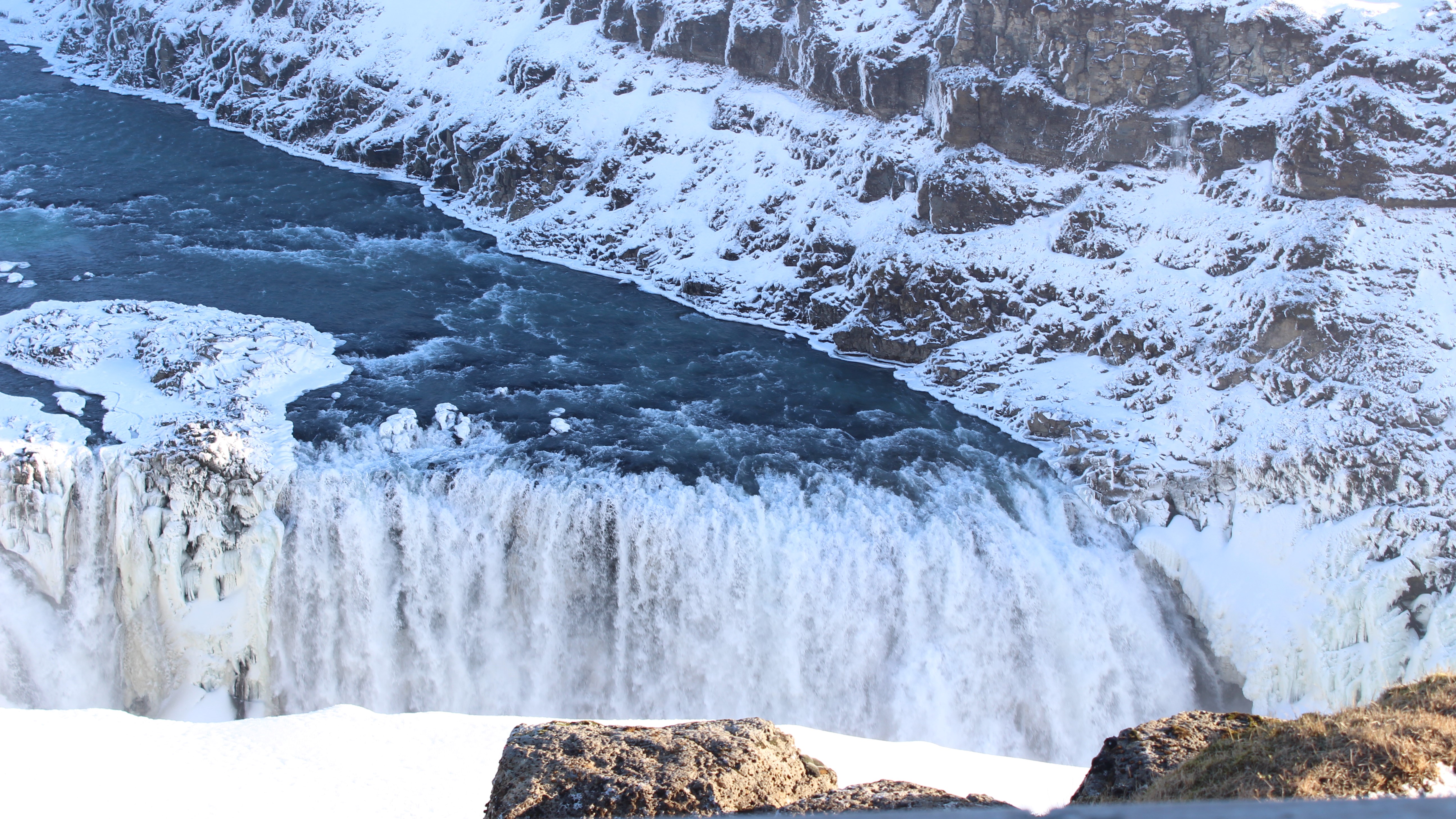 ist ein Wasserfall der Flusses Hvita. Das Wasser fällt über zwei Stufen 32 Meter hinab. (gull= Gold, foss= Wasserfall)